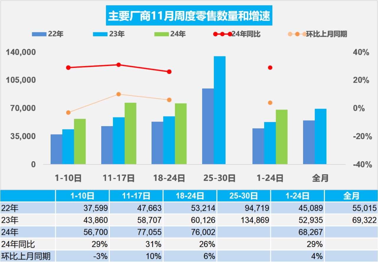 日前,乘联分会发布的最新数据显示,11月1-24日,乘用车市场零售163.8万辆,同比去年11月同期增长29%,较上月同期增长4%,今年以来累计零售1,947.4万辆,同比增长5%。