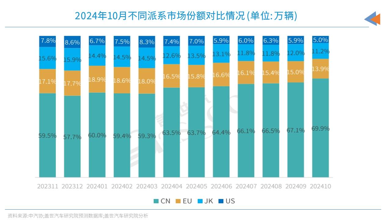 分派系看,10月保持销量同比增长的只有自主品牌,其他派系均出现了明显的同比销量下滑。10月自主品牌共计售车192.7万辆,同比提升了30%。市场份额方面,因为新能源业务的突出表现,自主品牌整体市占率再创历史新高,10月已经接近70%,同比上升了10.4个百分点,其他派系的市场份额,则全都在同比下滑