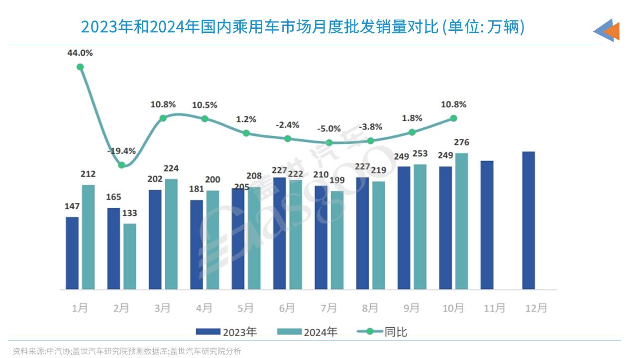 车元未来派整理的销量数据显示,2024年10月,国内乘用车市场同比、环比均实现了较大幅度的增长,月度共计售车276万辆,同比增长10.8%,环比增长8.9%。今年前10个月,车市整体也保持增长态势,累计销量达到2145万辆,较之去年同期提升了4%。