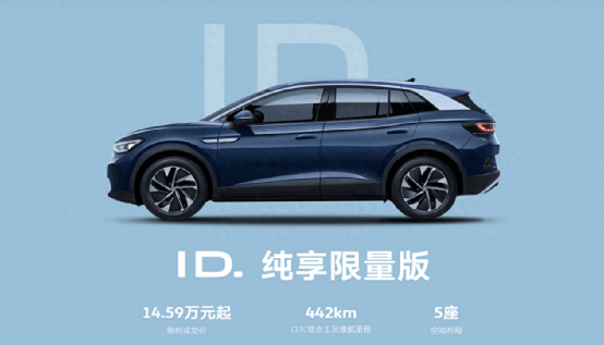 而大众方面ID.4 CROZZ纯电动SUV开启限时官降活动,指导价19.39万元起售的425续航版,官降4.8万元。
