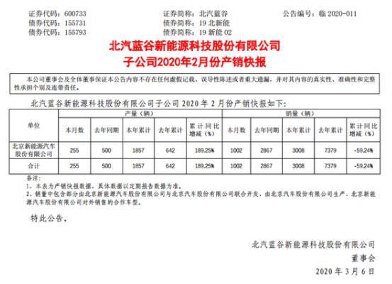 日前,北汽蓝谷发布子公司北汽新能源2月产销数据情况。数据显示,2月份北汽新能源销量为1002辆,较去年同期的2867辆减少65%。1-2月,北汽新能源累计销量为3008辆,同比减少59.24%。