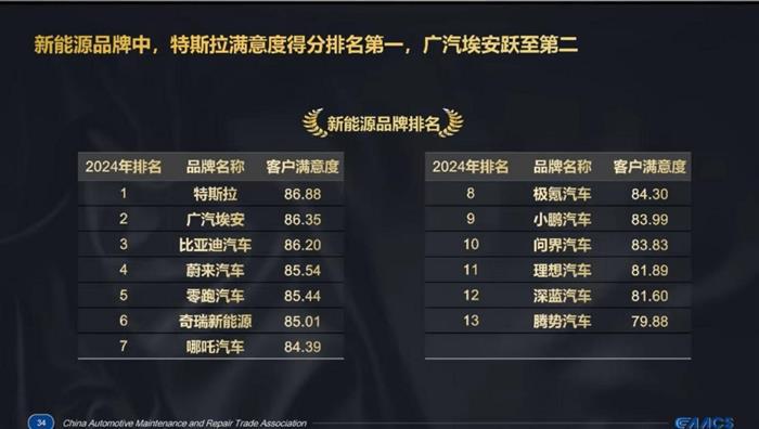 新能源汽车品牌用户满意度出炉,特斯拉、埃安、比亚迪包揽前三